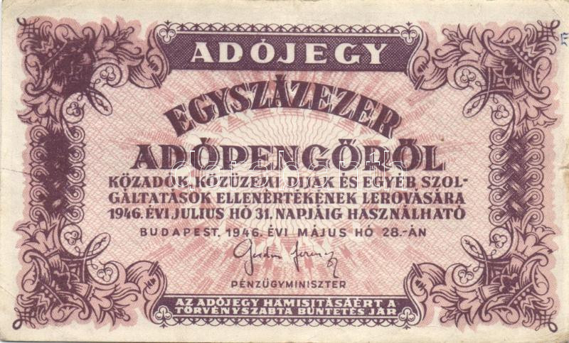 1946. 100.000AP vastag fehér papír "5600." rendelettel; előlapi, jobb oldali, igen erős festékelfolyással T:II- jobb oldalon kis berepedéssel