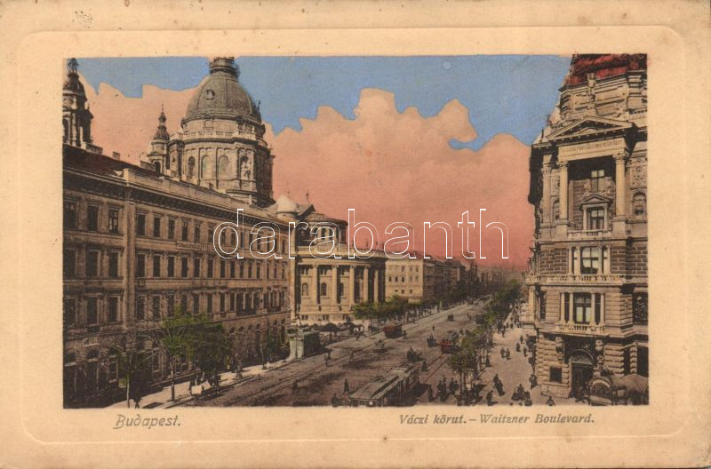 Budapest V. Váci körút a Pesti Biztosító Intézet épületével, Weissmayer Fuvarleveleket Felülvizsgáló irodájával és villamosokkal