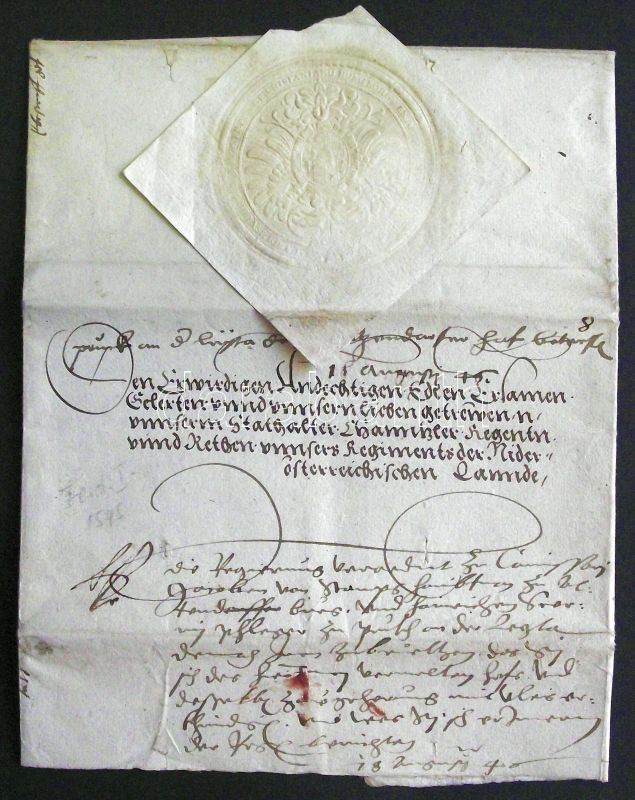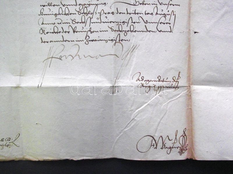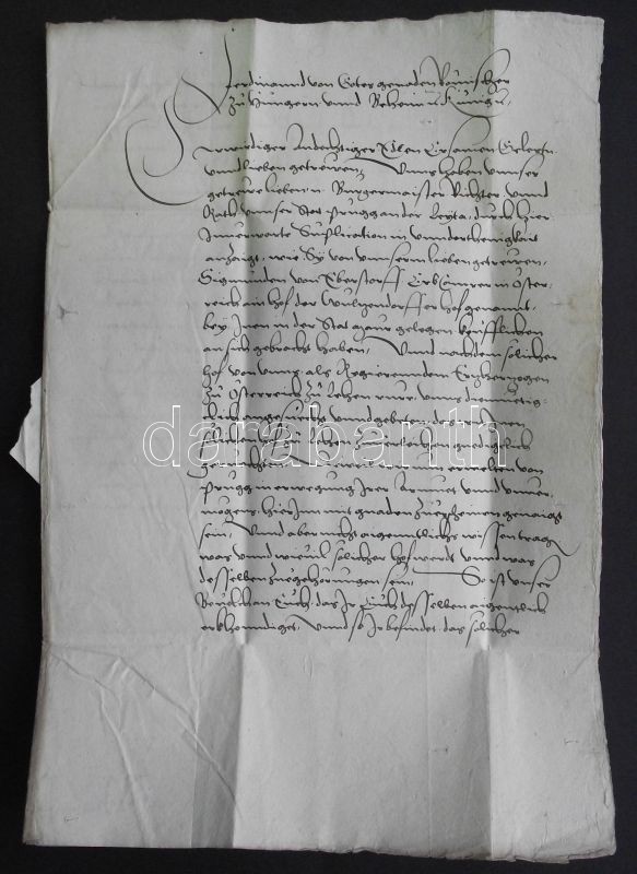 1546 I. Ferdinánd saját kezűleg aláírt levele Királyhida városának, melyben az általa eladományozott Wulzendorfer Hof nevű udvarház ügyében vizsgálatot rendel el, a város és Siegmund von Ebersdorf kamarás tulajdonos közötti nézeteltérések miatt. Királyi szárazpecséttel / Letter of Emperor Ferdinand with autograph signature. The letter is about a house called Wülzendorfer Hof in Bruck an der Leitha that the emperor awarded and there was a debate between the owner cameral Siegmund von Ebersdorf and the city.