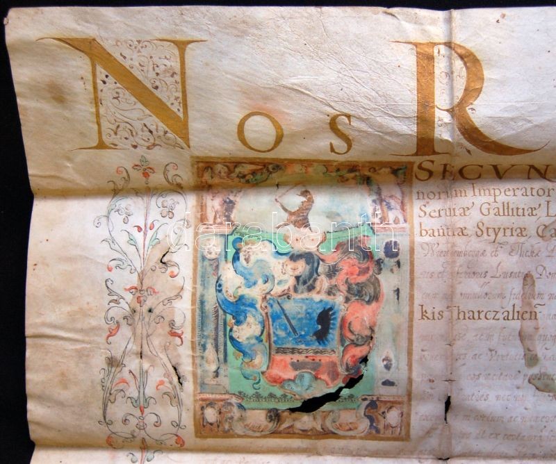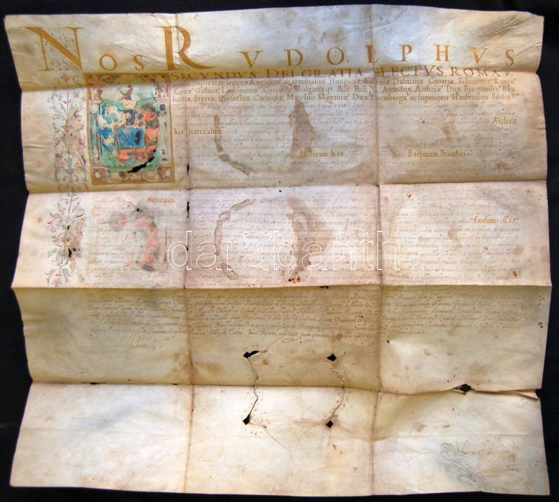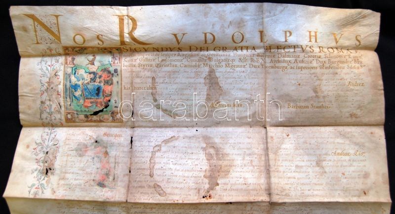 1604 V. Rudolf császár Prágában kiadott és saját kezűleg aláírt címeres-levele Tarczali Kis András agilis részére valamint feleségének Szinthei Barbarának vitéz és nemzetes nagylónyai Lónyay András ajánlásával. Kihirdetve Zemplénben 1607-ben. Pergamen, viaszpecsét nélkül 68x57 cm /Nagy Iván: Családtörténeti folyóirat III. évf. 149. old. 1901 / VÉDETT / Enobling letter of the Tarczal Kis Family autograph signed by Emperor Rudolph. Issued in Prague, announced in 1607. Parchment, without wax seal (Protected by the Hungarian state, can not be taken out of the country) 68x57 cm
