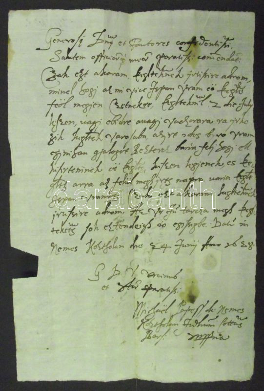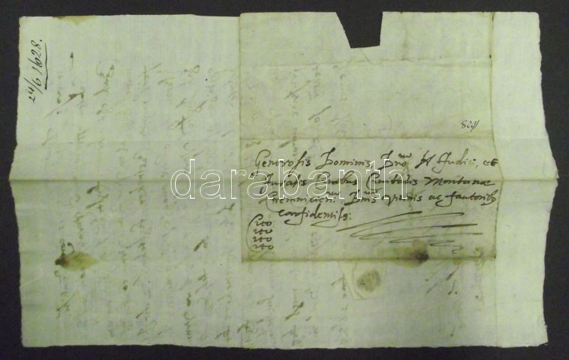 1628 Nemeskosztolány bírája által írt latin nyelvű cito, cito, citissime levél Körmöcbányára melyben a Főispán érkezését érintős előkészületekről, ír, szárazpecséttel / Cito cito citissime letter from Zemianske Kostolany to Cremnitz with dry-seal preparing the bailiff`s arrival