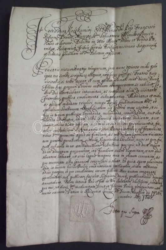 Description: 1687 A kecskeméti ferences szerzetes Gerard páter által jegyzett levél Körmöcbányai városi tanácsnak ferences szárazpecséttel / Letter signed by the grey friar pater Gerard of Kecskemét to the council of Cremnitz