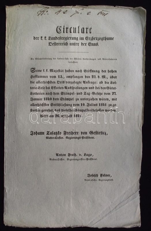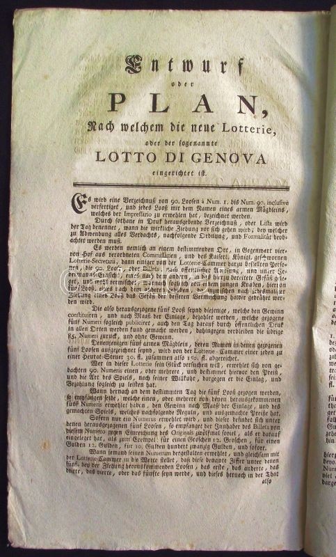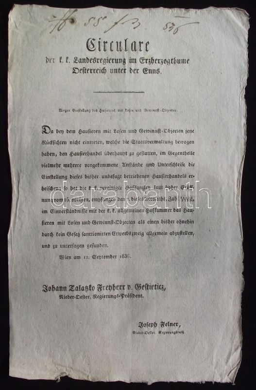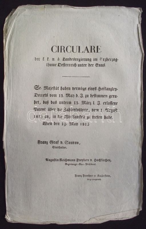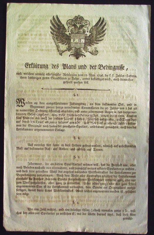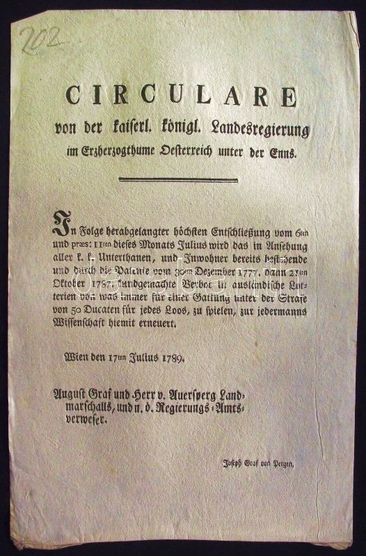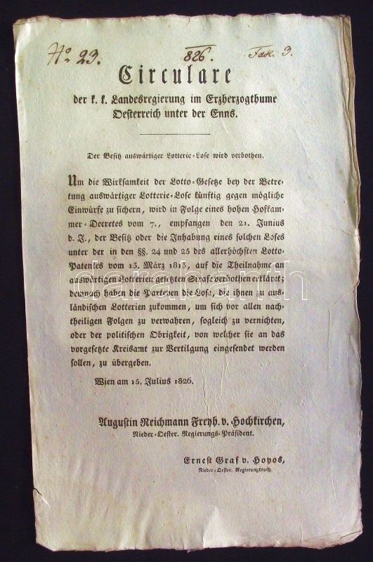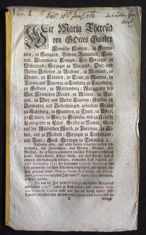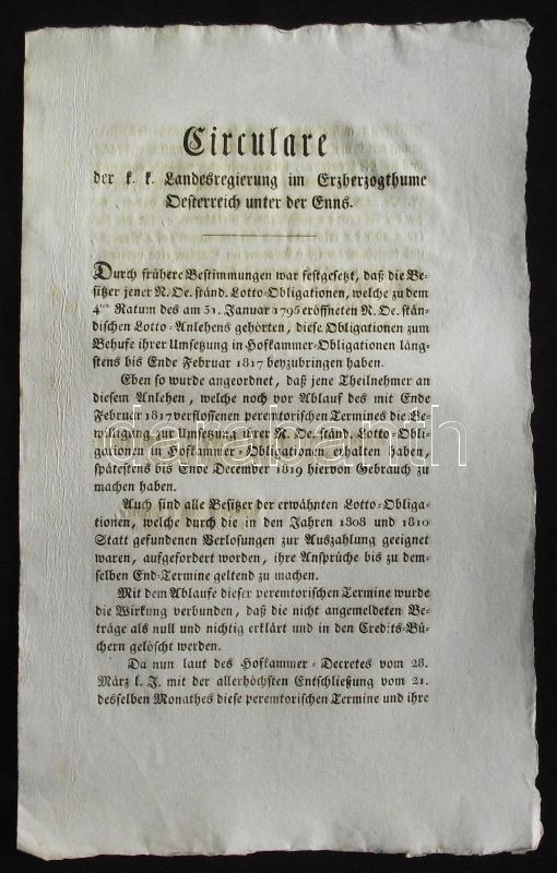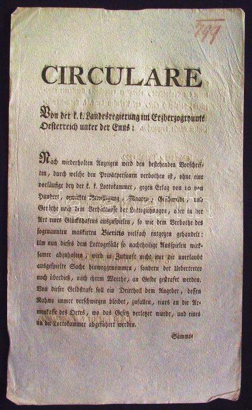 1762-1846 A Habsburg birodalom lottójátékai 20 darabos hirdetmény-gyűjtemény az állami sorsjátékokkal kapcsolatban. Kihirdető körlevelek, sorsjegy-minták / Collection of documents about the state-lottery of the Habsburg Empire. Announcements, samples from 1762 to 1846. Alltogether 20 documents: 1762 Lotto di Genova..., 1770 Lotto di Genova..., 1789 Circulare Verbot in ausländische Lotterien...