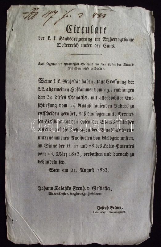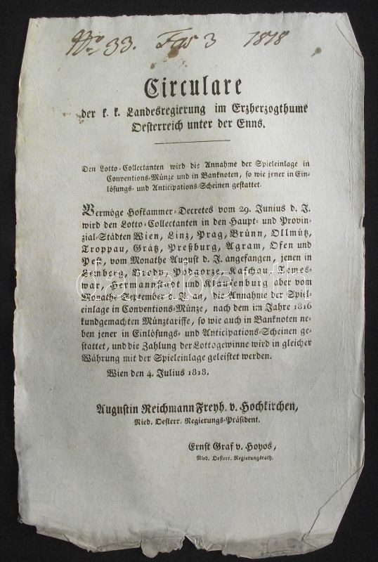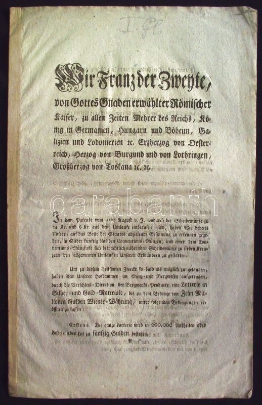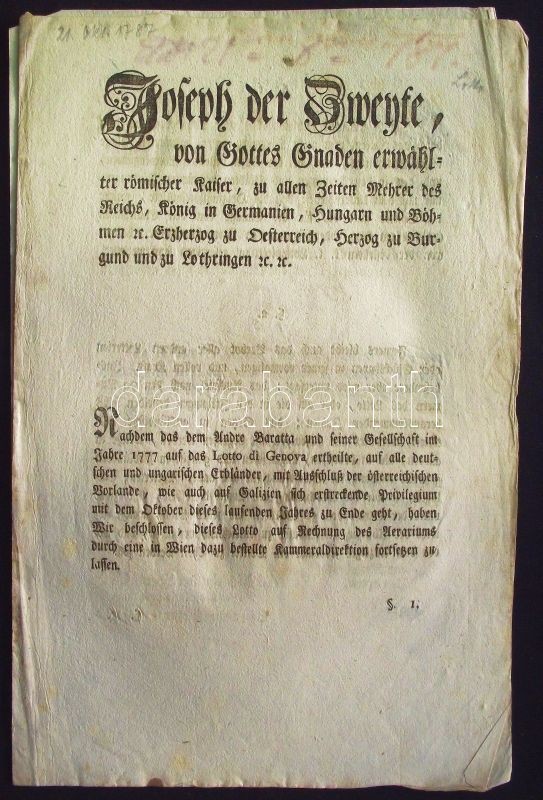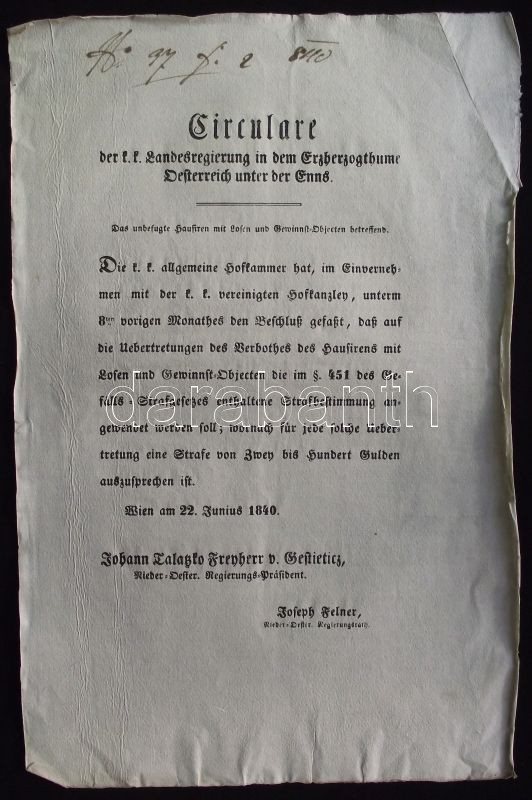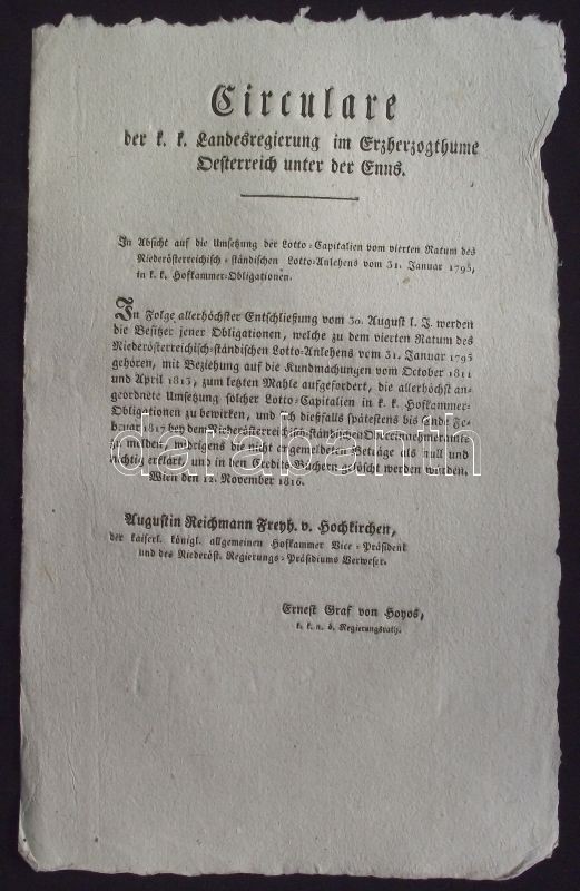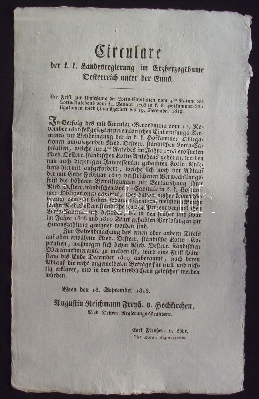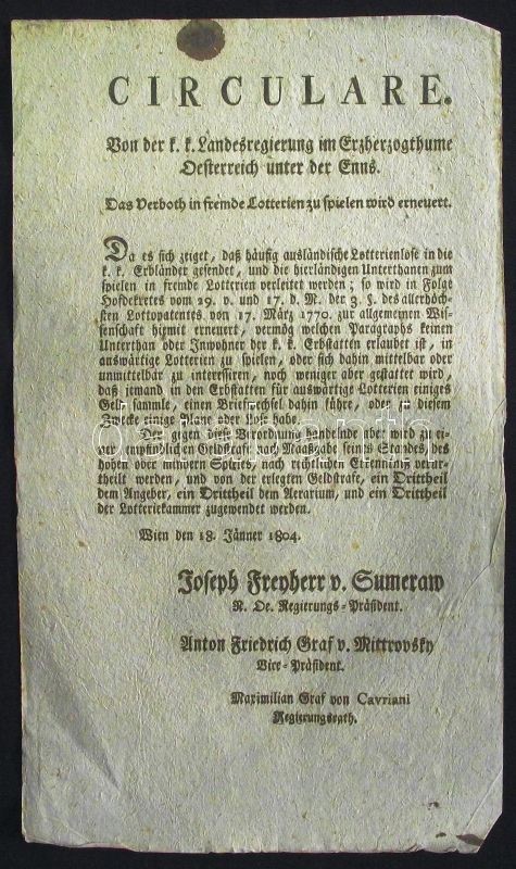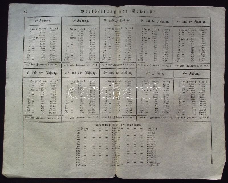 1762-1846 A Habsburg birodalom lottójátékai 20 darabos hirdetmény-gyűjtemény az állami sorsjátékokkal kapcsolatban. Kihirdető körlevelek, sorsjegy-minták / Collection of documents about the state-lottery of the Habsburg Empire. Announcements, samples from 1762 to 1846. Alltogether 20 documents: 1762 Lotto di Genova..., 1770 Lotto di Genova..., 1789 Circulare Verbot in ausländische Lotterien...