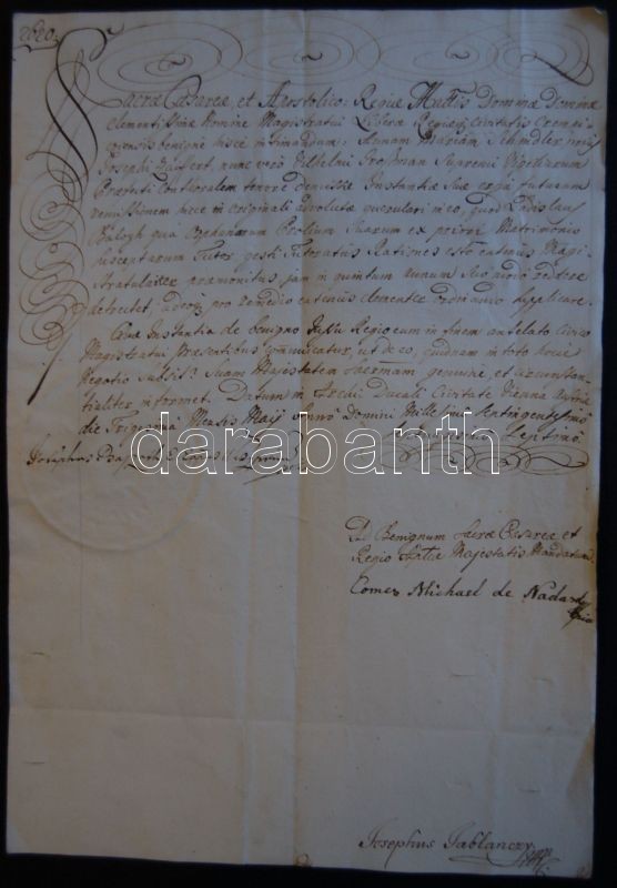1777 Polgárok által az uralkodóhoz felterjesztett ügy elbÃrálásáról értesÃtÅ‘ levél Bajzáth József veszprémi püspök, gróf Nádasdy Mihály fÅ‘kamarás által saját kezű aláÃrásával és uralkodói szárazpecséttel / Ex offo letter with royal dry-seal, autograph signed by Josephus Bajzath bishop of Veszprém and count Michael de Nadasdy chamberlain