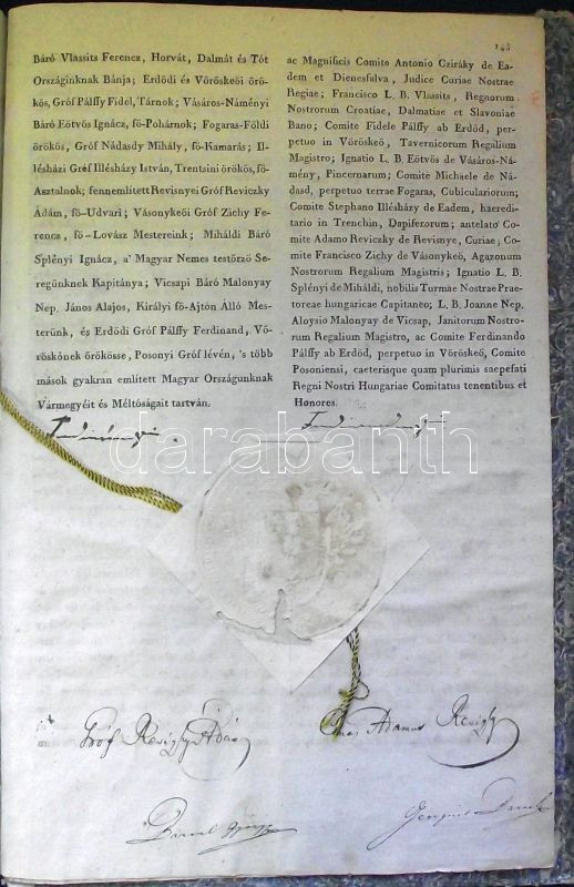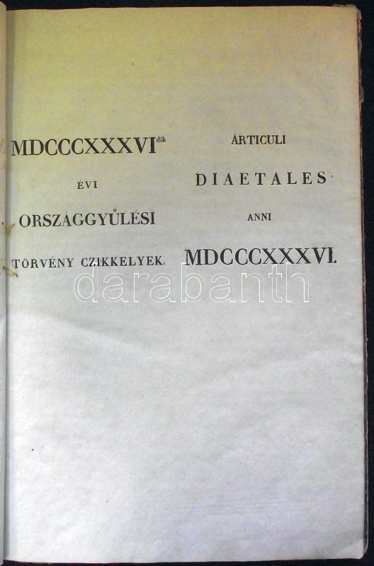 1836-dik évi országgyűlési törvény czikkelyek: A berekesztett 1836-os reformországgyűlés uralkodó által szentesített törvényei korabeli papír keménykötésben magyar és német nyelven. 145 oldal. Az utolsó lapon mindkét változat alatt V. Ferdinánd, gróf Reviczky Ádám főkancellár saját kezű aláírásaival / Laws of the 1836 Hungarian Parliament in German and Hungarian 145 pages. On the last page both version with autograph signatures of Emperor Ferdinand and count Adam Reviczky chancellor. Bound in hard-cover paper 25x35 cm
