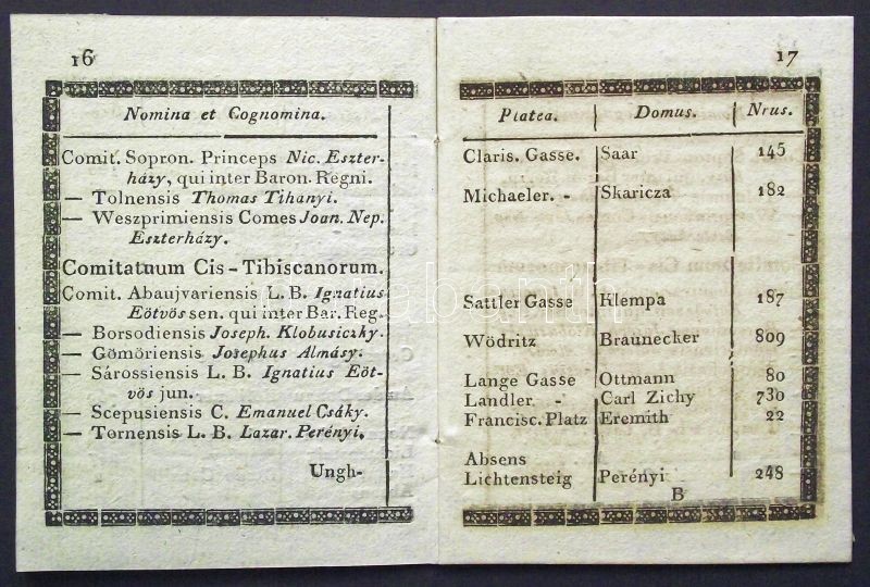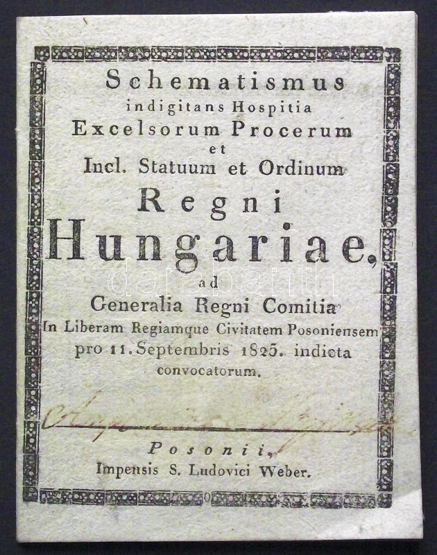 Schematismus ...Regni Hungariae, ad Generalia Regni Comitia in liberam reiamque civitatem Posoniensem pro 11. Septembris 1825. indicta convocatorum, Az 1825-ös országygyűlésre kiadott schematismus táblázatos formában tartalmazza a megyei kiküldöttek nevét és pontos szállását Pozsony, Weber, 1825, 32p. szép állapotban / The Schematismus includes the names and exact adresses of the delegates to the Parliament. Nice condition 32p.