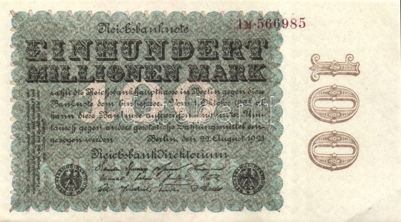 Német Birodalom / Weimari Köztársaság 1923. 100.000.000M (2x) cégnyoma... https://www.darabanth.com/en/120-Online-auction/120.0/Numismatics/~30253/Nemet-Birodalom-Weimari-Koztarsasag-1923-100000000M-2x-cegnyomat-Kreuzbluten-vizjell~II317103