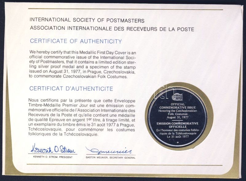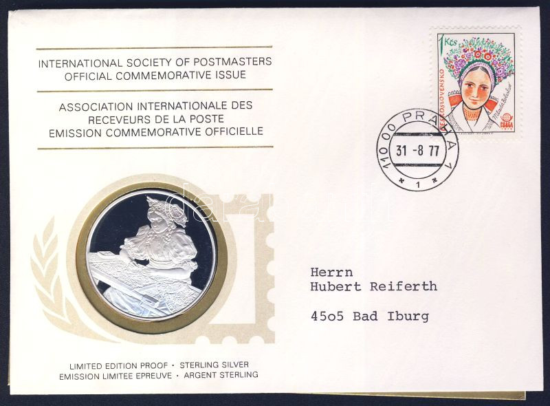 Description: Csehszlovákia 1977. "Népviselet" a Postamesterek gondozásában kiadott Ag emlékérem 20g érmés, bélyeges borítékon, csehszlovák bélyeggel, elsőnapi bélyegzővel, német nyelvű ismertetővel T:PP