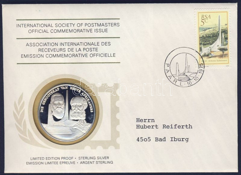 Description: Dél-Afrika 1975. "Afrikai nyelv" a Postamesterek gondozásában kiadott Ag emlékérem 20g érmés, bélyeges borítékon, dél-afrikai bélyeggel, elsőnapi bélyegzővel, német nyelvű ismertetővel T:PP