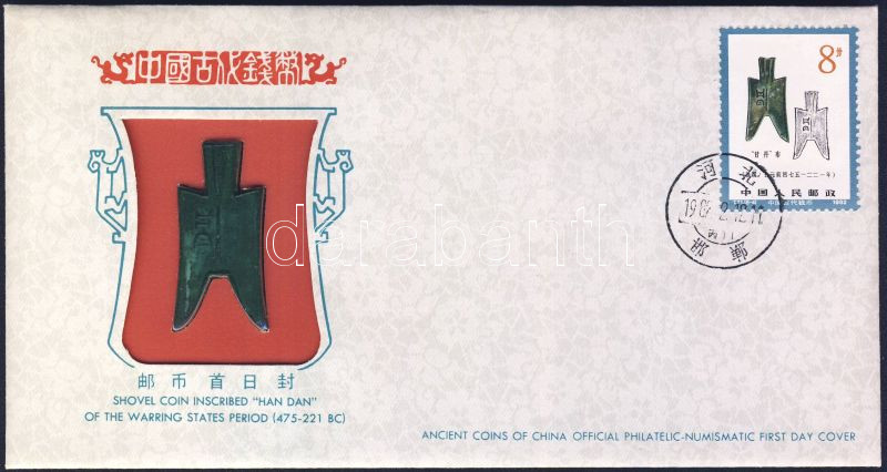 Kína/Hadakozó Államok korszaka/Zhao királyság ie.475-221. Lapátpénz "HAN DAN" bevéséssel replikát érmés, bélyeges elsőnapi borítékon, hátoldali tanúsítvánnyal T:1