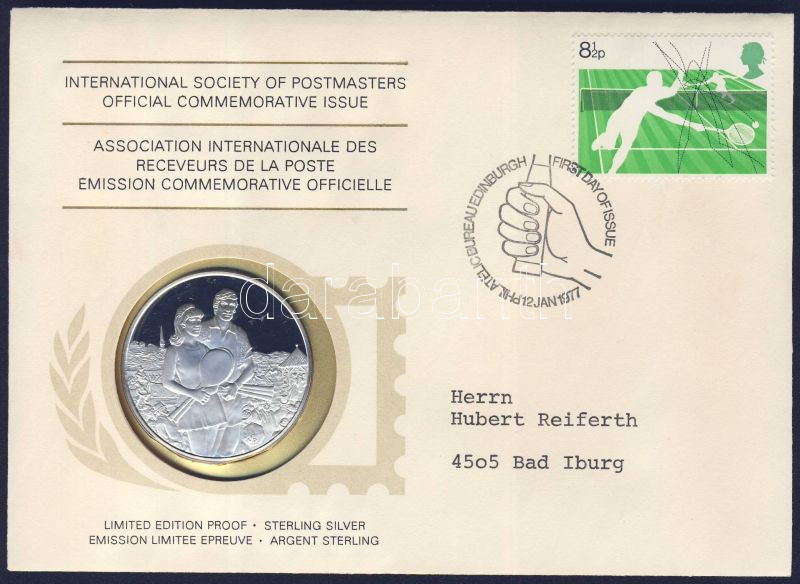 Description: Nagy-Britannia 1977. "100 éves a Wimbledoni Teniszbajnokság" a Postamesterek gondozásában kiadott Ag emlékérem 20g érmés, bélyeges borítékon, brit bélyeggel, elsőnapi bélyegzővel, német nyelvű ismertetővel T:PP