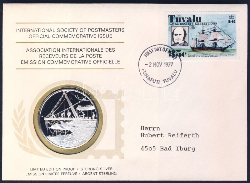 Tuvalu 1977. "A londoni Királyi Társaság expedÃciója Tuvaluba" a Postamesterek gondozásában kiadott Ag emlékérem 20g érmés, bélyeges borÃtékon, tuvalui bélyeggel, elsÅ‘napi bélyegzÅ‘vel, német nyelvű ismertetÅ‘vel T:PP