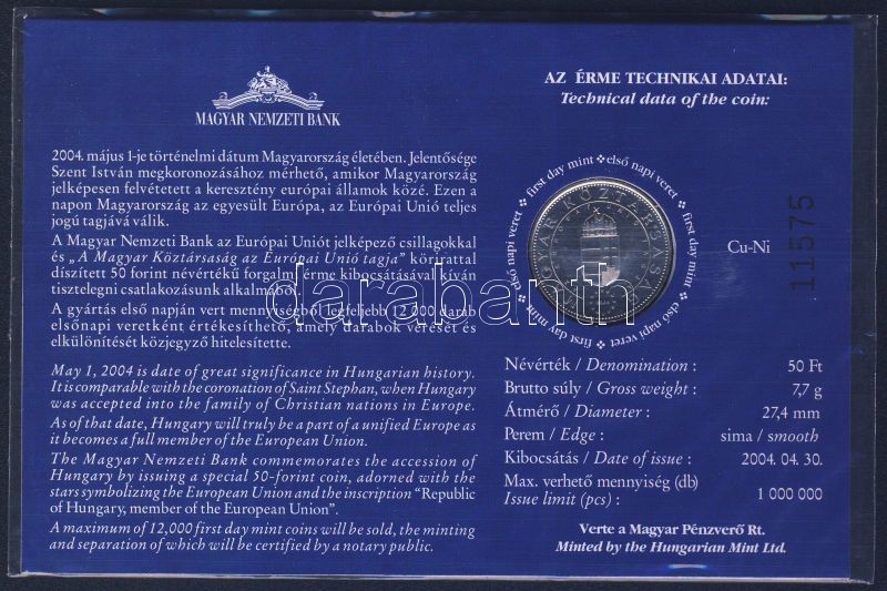 https://www.darabanth.com/en/120-Online-auction/120.0/Numismatics/~30267/2004-50Ft-Magyarorszag-az-EU-tagja-elsonapi-veret-sorszamozott-emleklapon-T1-Csak-12000db~II322686