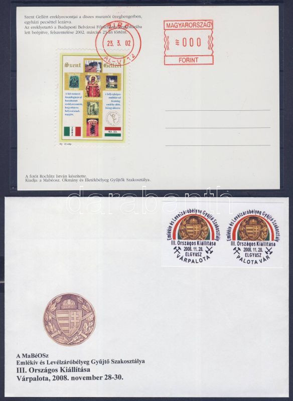 2002 Okmánybélyeg szakosztály levelezőlap Szt. Gellért bélyeggel + 2008 ELGYÜSZ kiállítás levélzárópár reklámborítékon