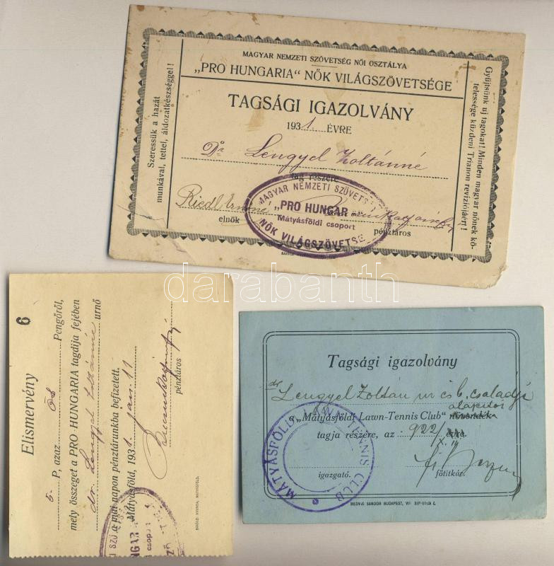 1922 Mátyásföldi Lawn-Tennis Club tagsági igazolványa és a Nők Világsz... https://www.darabanth.com/en/120-Online-auction/120.0/Other-collectibles/~367/1922-Matyasfoldi-Lawn-Tennis-Club-tagsagi-igazolvanya-es-a-Nok-Vilagszovetsegenek-2db-193~II298943
