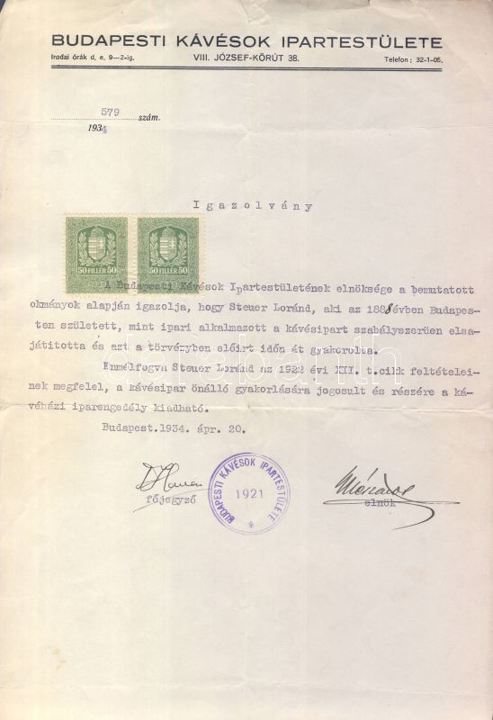 https://www.darabanth.com/en/120-Online-auction/120.0/Other-collectibles/~367/1934-Budapesti-Kavesok-Ipartestulete-igazolvany-es-iparengedely-Cofee-industry-permission~II322322