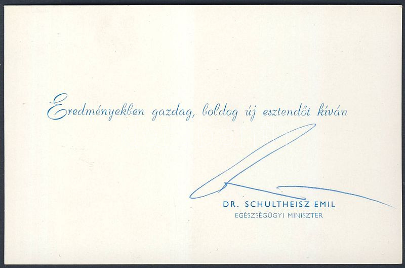 Dr. Schultheisz Emil egészségügyi miniszter aláírása üdvözlőkártyán