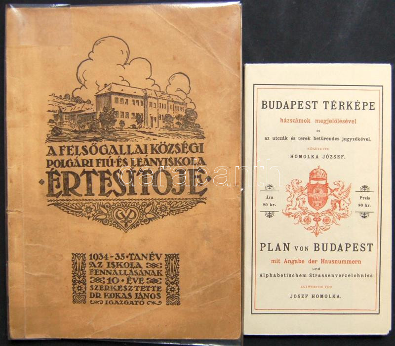 1934-1935 A Felsőgallai Községi Polgári Fiú- és Leányiskola értesítője illetve Homolka József készítette Budapest térkép nagyon szép állapotban