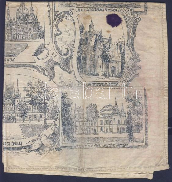 1896 Ezredéves országos kiállítás emlékére készített terítő 39 x 40 cm, a kiállítás épületeivel (tintafoltos)