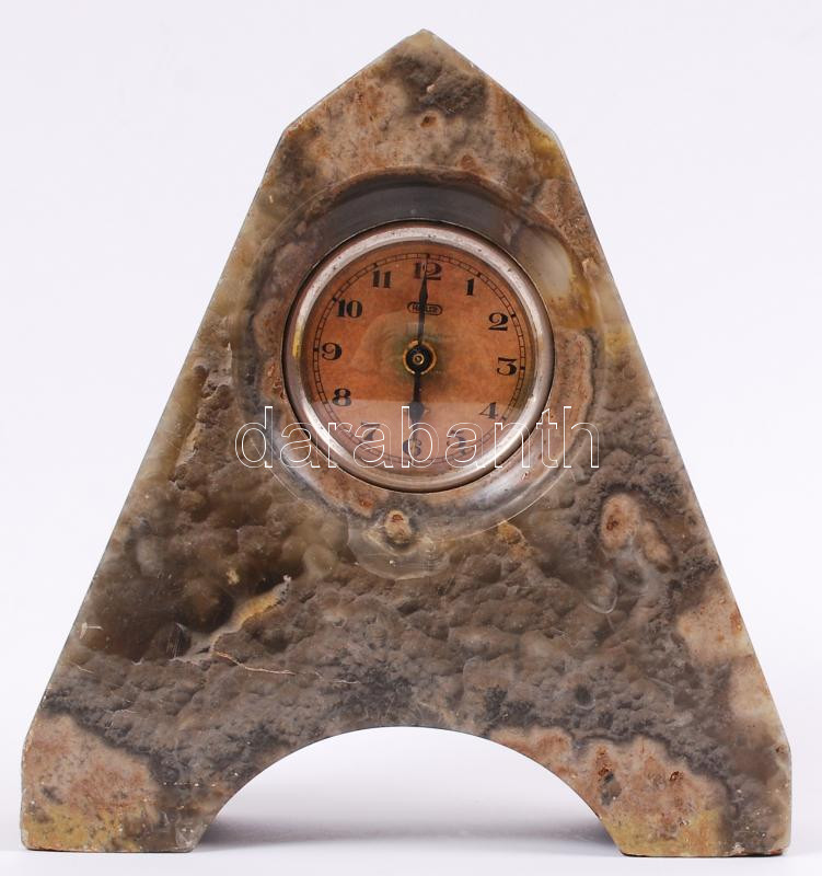 ~1900 Háromszög alakú márványkőbe foglalt óra, javításra szorul (méretek: 16x17x6cm) / Clock in marble stone (out of order)