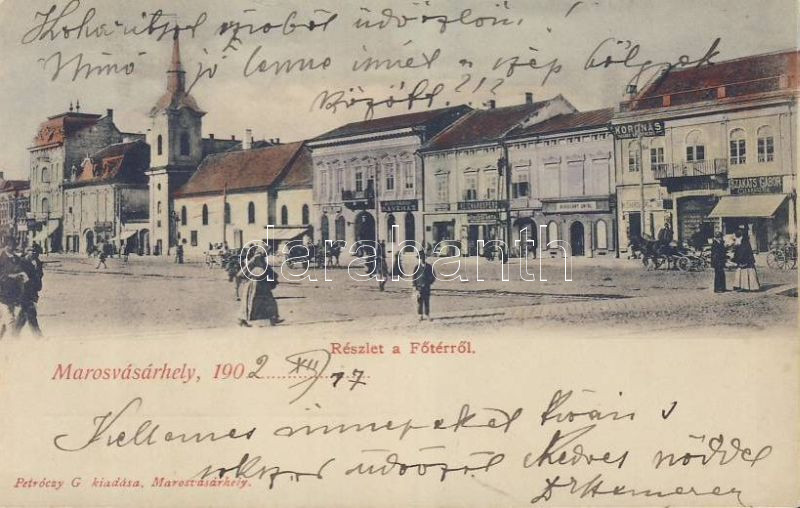 Marosvásárhely with Café Hungária, Koronás savings bank, the confectionery of Gábor Szakáts and the shops of Antal Kőszegi and Antal Nuridsány