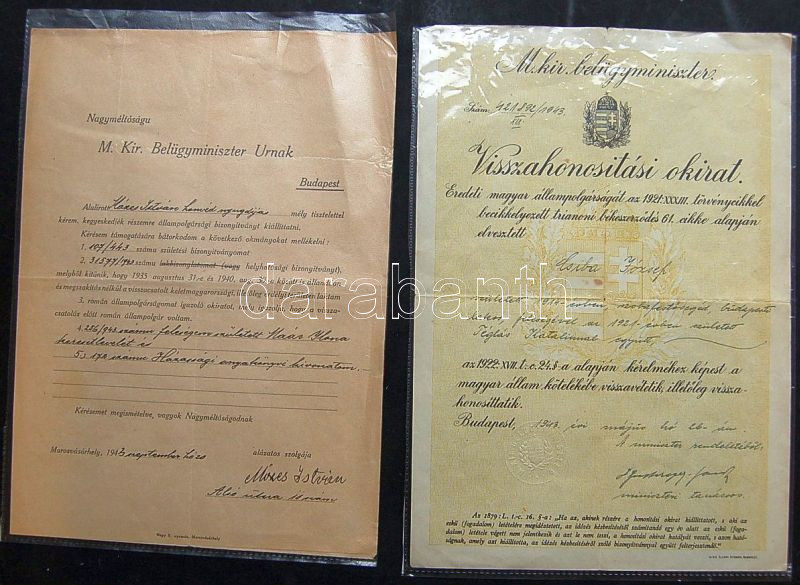 1943 M.Kir.Belügyminiszteri okmányok, mint egy Visszahonosítási Okirat...