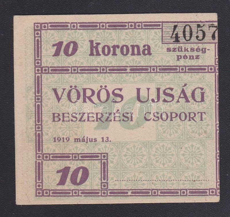 https://www.darabanth.com/en/130-Online-auction/130.0/Numismatics/~873/1919-Voros-ujsag-10K-szuksegpenz-TI-kis-sarokhajlas~II368064