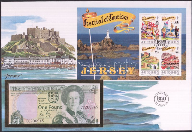 Jersey 1989. 1Ł dekoratív, nagyalakú bankjegyes, bélyeges borítékon, bélyegblokkal, első napi bélyegzővel T:I