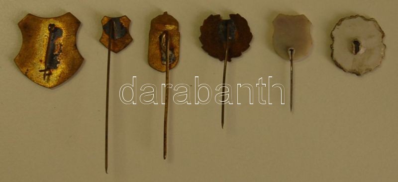 kis kitűző tétel: 6db magyar címeres kitűző, köztük 5db "Kossuth címeres" zománcozottak többnyire (egyikről letört a tű)
