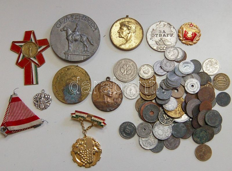 Kis vegyes tétel közte: 1947. 2Ft "Kossuth címer", emlékérmek, fillérek, kitüntetések, külföldi pénzek T:vegyes