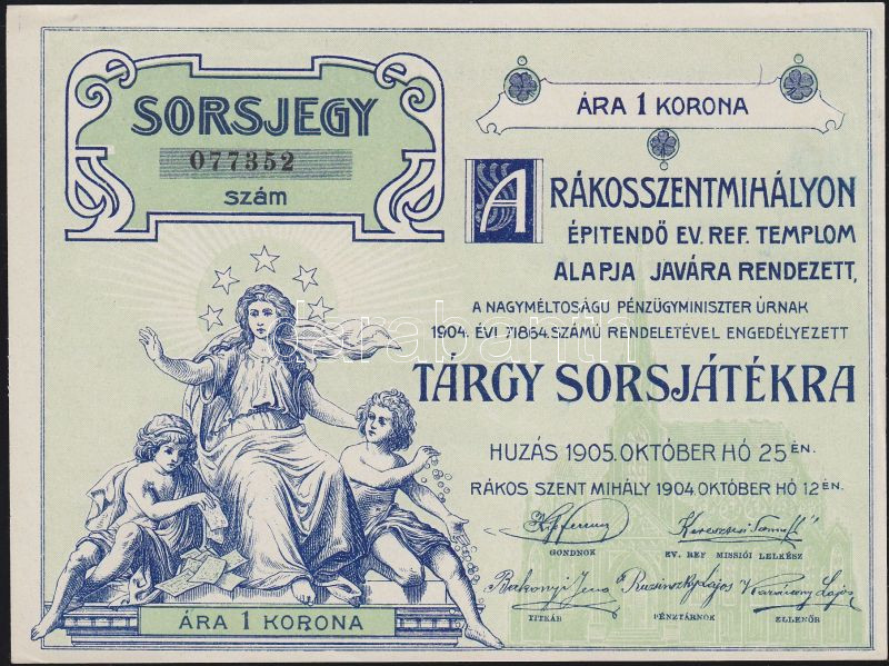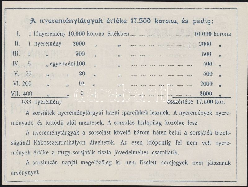 https://www.darabanth.com/en/133-Online-auction/133.0/Numismatics/Necessity-Coins-and-Notes~400127/1905-Rakosszentmihaly-Evangelikus-templom-javara-rendezett-sorsjatek-sorsjegy-1K-TI~II380476