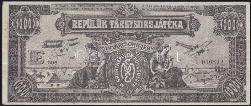 1926 "Repülők tárgysorsjátéka" 10.000K dollár sorsjegy. "Ára 80fillér..." fny-sal T:III+