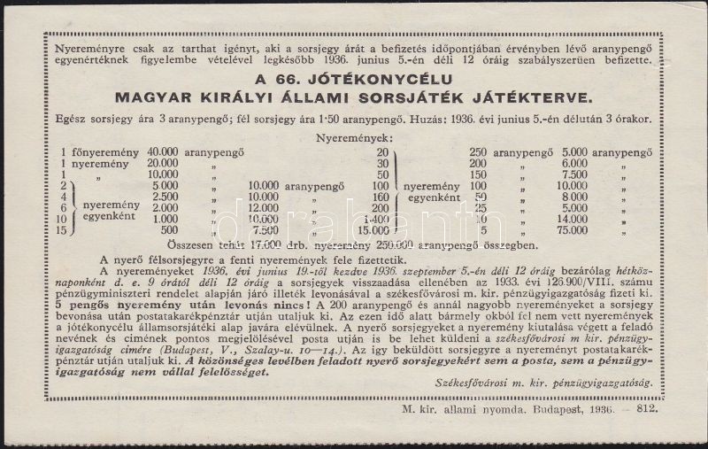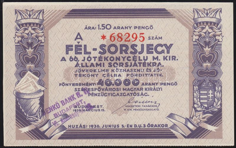 1936 március 15. "Fél-sorsjegy a 66. jótékonycélú Állami sorsjátékra" ...