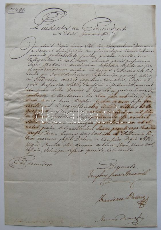 Description: 1805 Helytartótanácsi levél gr. Brunswick József országbíró, Darvas Ferenc költő, követ és Bereczky János saját kezű aláírásaival / Official letter ot the Governing Council with signatures