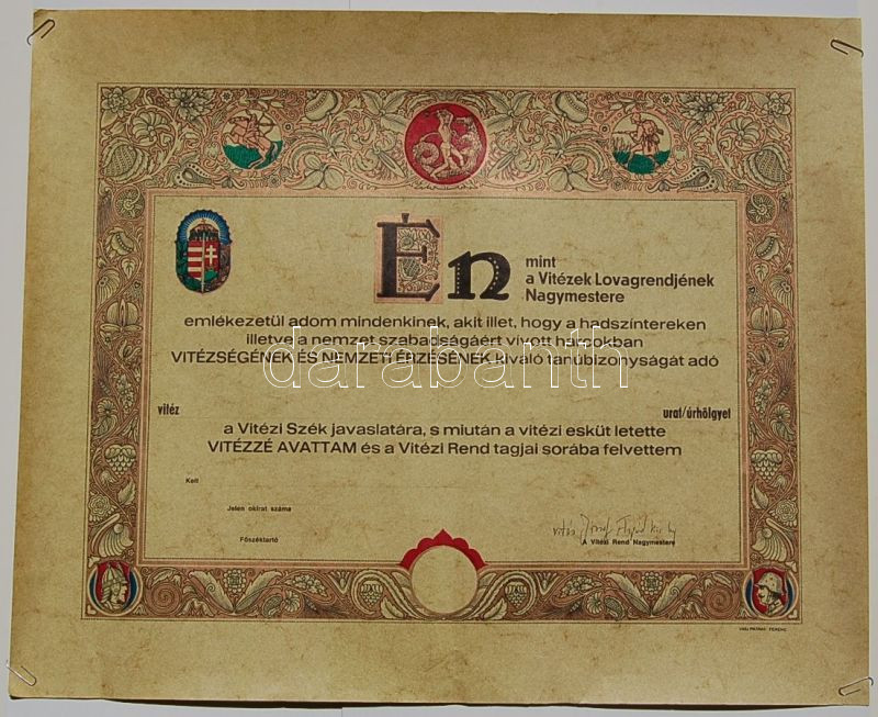 https://www.darabanth.com/en/133-Online-auction/133.0/Other-collectibles/Military~272/1990-utani-kitoltetlen-Vitezi-Rend-Adomanyozo-oklevel-Jozsef-Arpad-vitezi-elnok-alaira~II380590