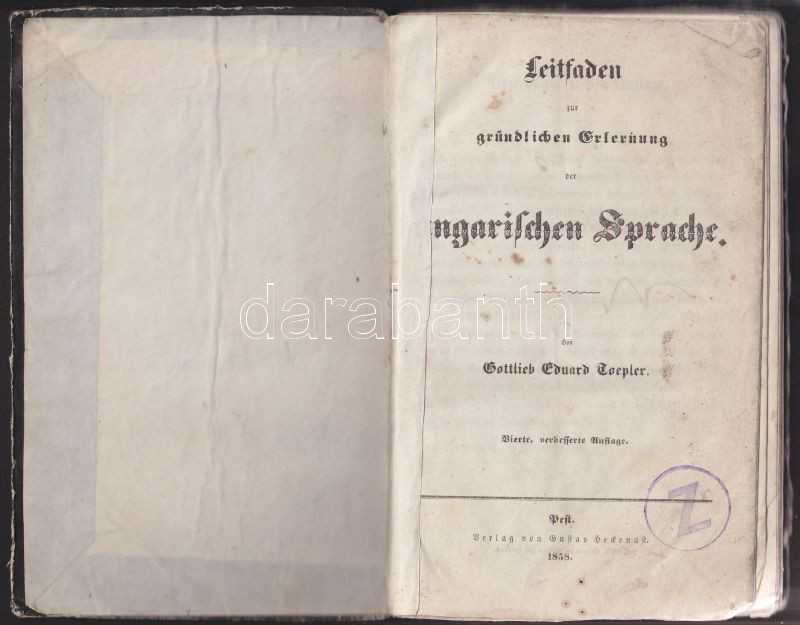 1858-ben Pesten kiadott magyar nyelvkönyv német nyelven Gottfried Eduard Toeppler, (az utolsó kb 4 oldal hiányzik, valamint a kötés sérült)