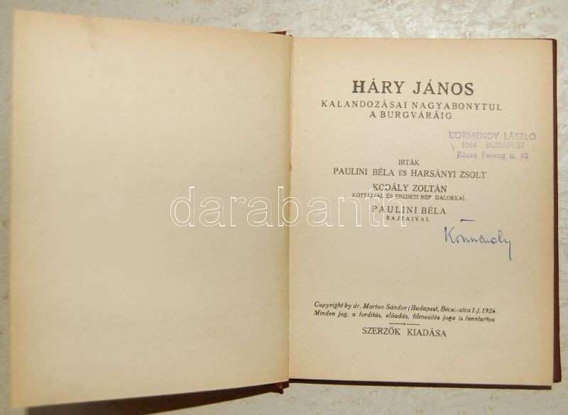 Paulini Béla - Harsányi Zsolt: Háry János kalandozásai Nagyabonytul a ... https://www.darabanth.com/en/134-Online-auction/134.0/Other-collectibles/Books-other-rarities~199/Paulini-Bela--Harsanyi-Zsolt-Hary-Janos-kalandozasai-Nagyabonytul-a-Burgvaraig-Irtak--~II385168