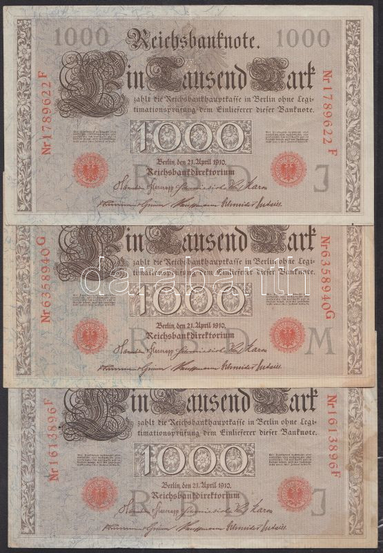 Német Birodalom 1910. 1000M (3x) hétjegyű sorszámmal T:III