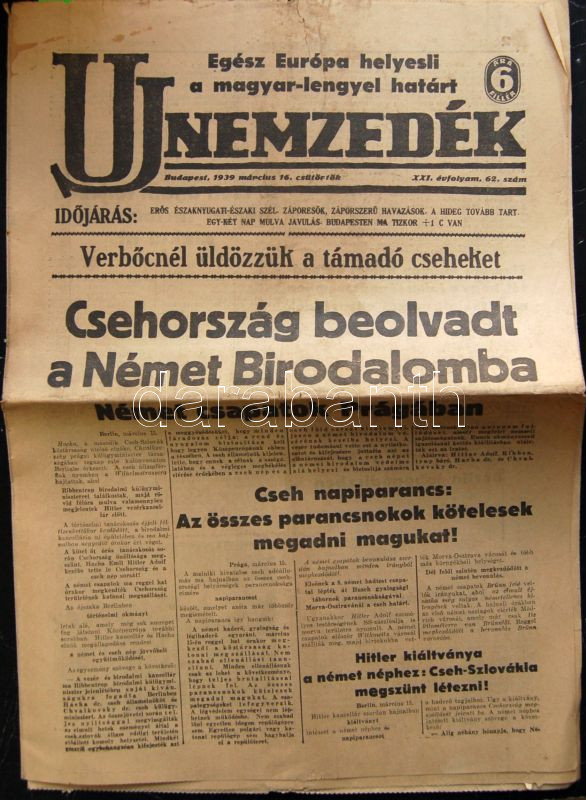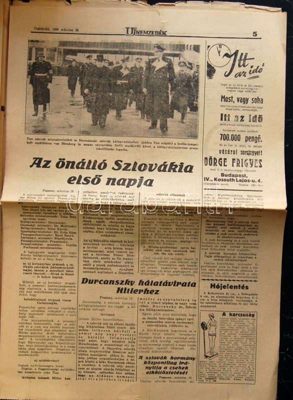 1939 Az Új nemzedék újság március 16.-i száma, a második Bécsi döntés híreivel szövegével és a Szlovák állam első napjáról szóló tudósítással / Newspaper with the second Treaty of Vienna which has anexxed the Czech-lands to Germany and the first day of the independent Slovakia