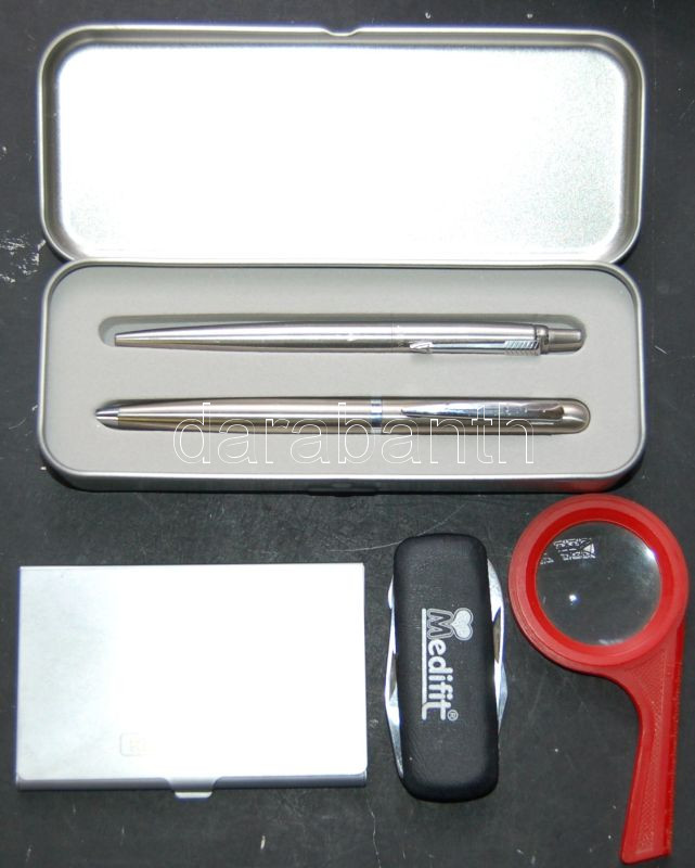 Kis bolha: tolltartó, tollak, névjegykártyatartó, bicska, nagyító