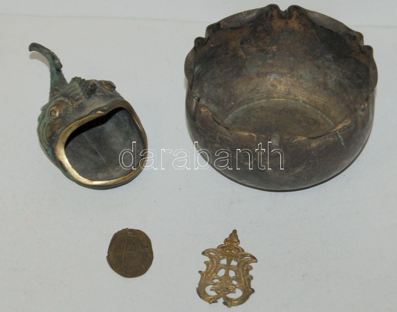 Kis réz tétel: cethal alakú hamutál, asztali tálka, 2 kis dísz