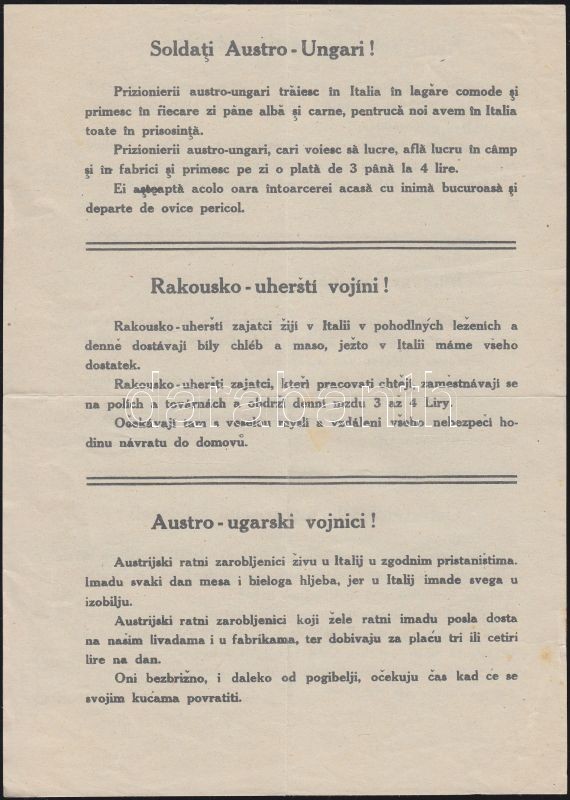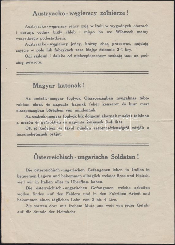 cca 1916 I. vh. olasz demoralizáló szórólap az osztrák.magyar katonák ...