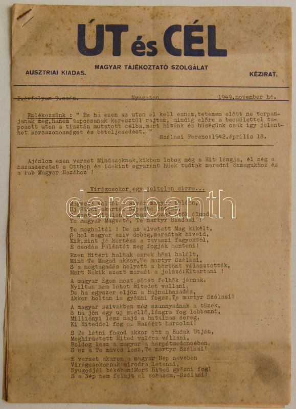 https://www.darabanth.com/en/136-Online-auction/136.0/Other-collectibles/Printed-Materials~223/1949-Az-Ut-es-Cel-emigracios-Hungarista-lap-ausztriai-kiadasa-Kezirat-jelzessel-Hungaris~II392300