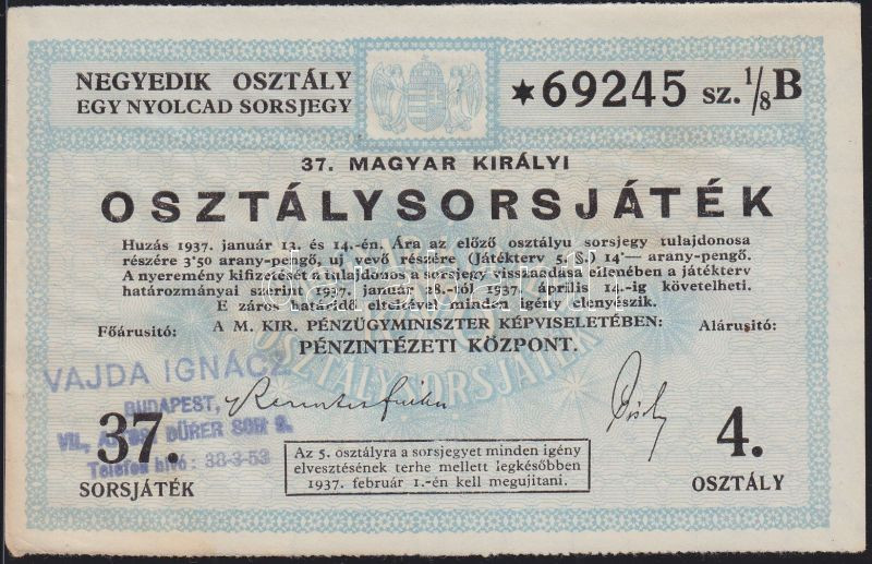 https://www.darabanth.com/en/137-Online-auction/137.0/Numismatics/Shares-Securities-and-Tickets~500086/1937-37-Magyar-Kiralyi-Osztalysorsjatek-negyedik-osztaly-egy-nyolcad-sorsjegye-TII~II395440