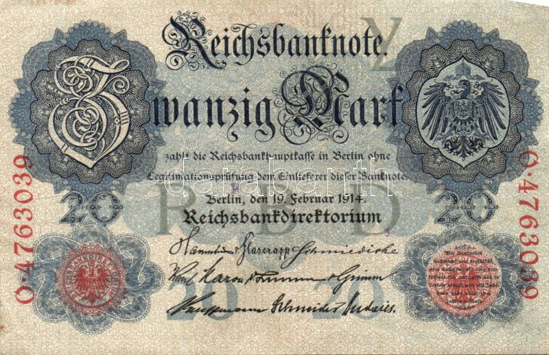 Német Birodalom/Császárság 1914. 20M 7 számjegyű sorszámmal T:III+