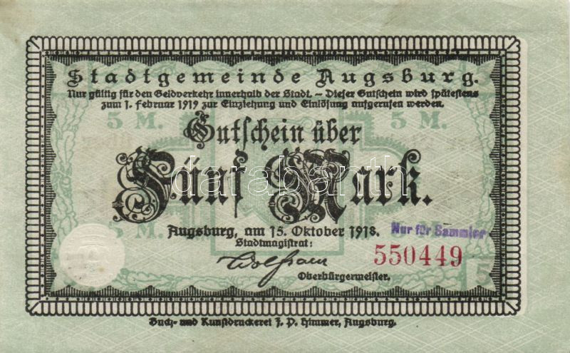 Description: Német Birodalom/Weimari Köztársaság/Erkelenz 1918.11.12. 5M T:I- + Német Birodalom/Császárság/Augsburg 1918.10.15. 5M, 10M hivatalos érvénytelenítéssel T:II,II-