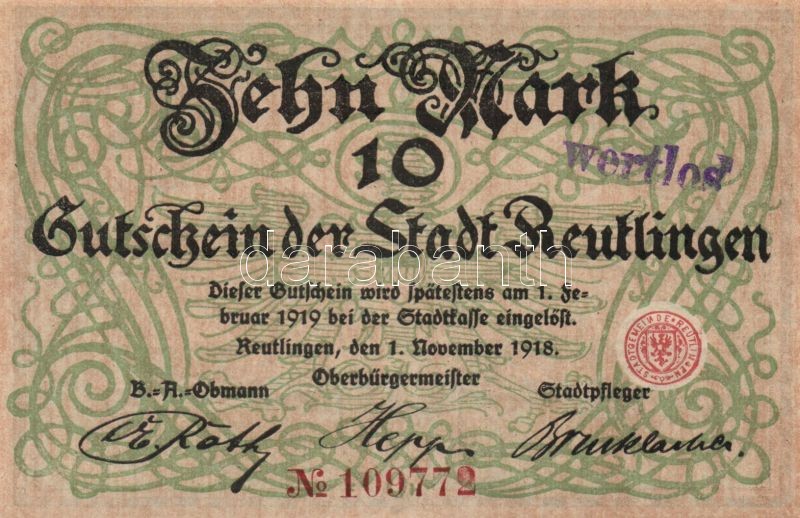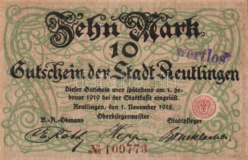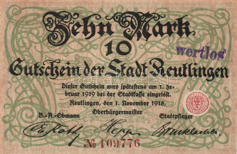 Német Birodalom/Weimari Köztársaság/Reutlingen 1918.11.1. 10M (5x) egy...