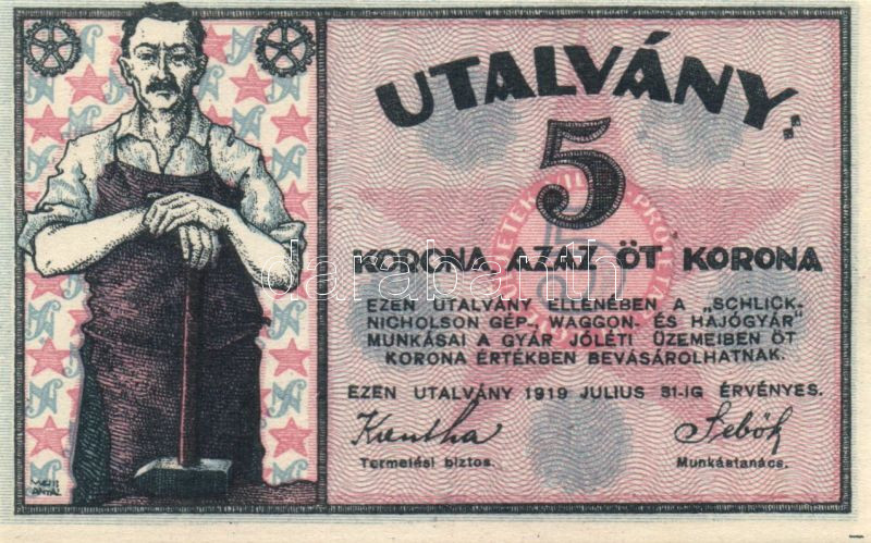 https://www.darabanth.com/en/139-Online-auction/139.0/Numismatics/Hungarian-and-foreign-emergency-notes-and-coins-tokens~10007/Budapest-1919-Schlick-Nicholson-Gep-Wagon-es-Hajogyar-5K-utalvanya-TI~II404209