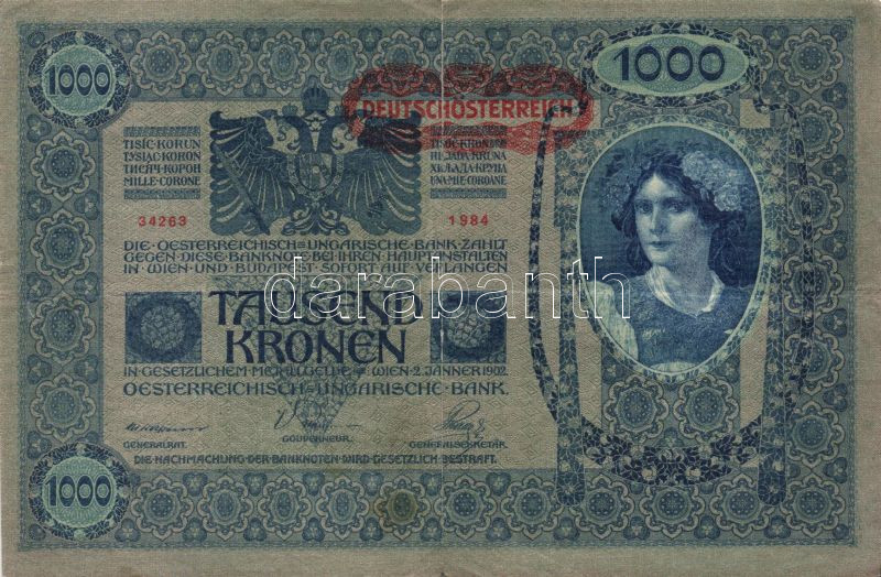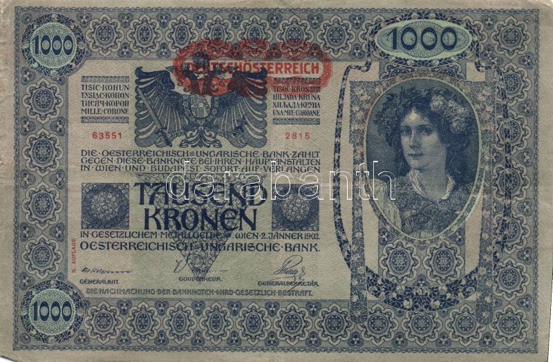 https://www.darabanth.com/en/139-Online-auction/139.0/Numismatics/Hungarian-banknotes~10008/1902-1000K-2x-vizszintes-Deutschosterreich-felulnyomassal-TIII-III-~II404146